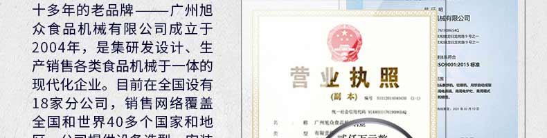 廣州旭眾食品機(jī)械有限公司是一家集科研開發(fā),生產(chǎn)設(shè)計(jì),營(yíng)銷服務(wù)為一體的現(xiàn)代化生產(chǎn)企業(yè)。現(xiàn)代化生產(chǎn)車間,精湛制造技術(shù),所產(chǎn)機(jī)械歷經(jīng)市場(chǎng)重重考驗(yàn),不斷贏得海內(nèi)外客戶的贊譽(yù)。