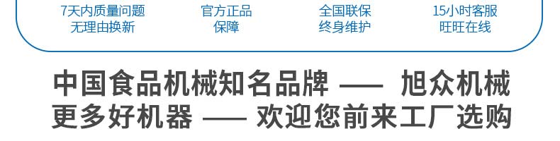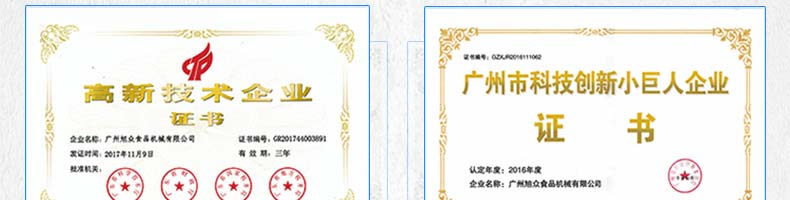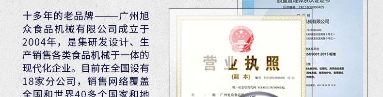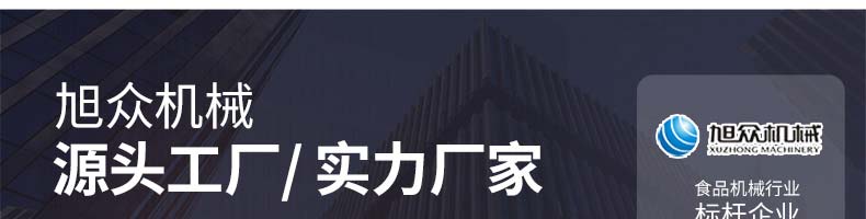 廣州旭眾食品機械有限公司是一家集科研開發(fā),生產設計,營銷服務為一體的現代化生產企業(yè)。現代化生產車間,精湛制造技術,所產機械歷經市場重重考驗,不斷贏得海內外客戶的贊譽。
