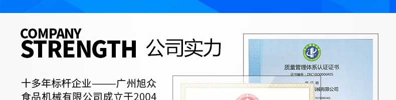 廣州旭眾食品機械有限公司是一家集科研開發,生產設計,營銷服務為一體的現代化生產企業?,F代化生產車間,精湛制造技術,所產機械歷經市場重重考驗,不斷贏得海內外客戶的贊譽。