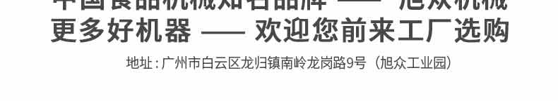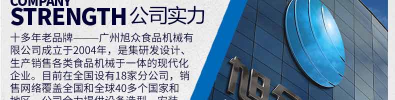 廣州旭眾食品機械有限公司是一家集科研開發,生產設計,營銷服務為一體的現代化生產企業。現代化生產車間,精湛制造技術,所產機械歷經市場重重考驗,不斷贏得海內外客戶的贊譽。