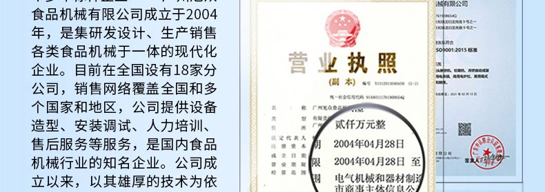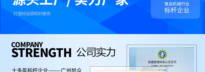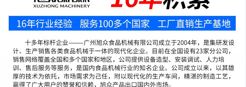 廣州旭眾食品機械有限公司是一家集科研開發,生產設計,營銷服務為一體的現代化生產企業。現代化生產車間,精湛制造技術,所產機械歷經市場重重考驗,不斷贏得海內外客戶的贊譽。
