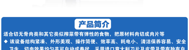 臺(tái)式全自動(dòng)切片機(jī),適合切無(wú)骨肉類和其他類似榨菜帶有彈性的食物,把原材料肉切成肉片,并可自動(dòng)成卷狀。可切牛肉片、羊肉片等