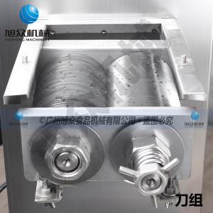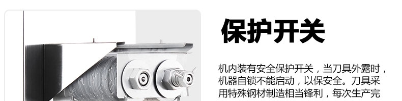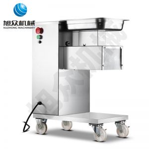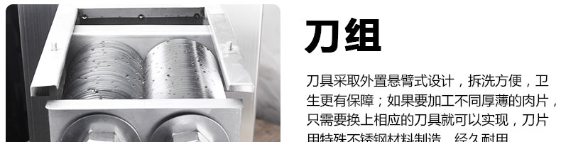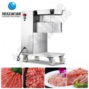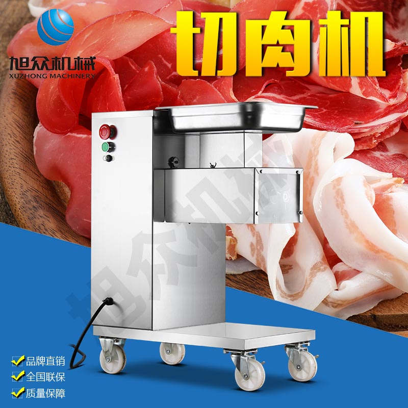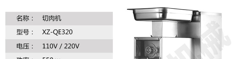 XZ-QE切肉機,是一款可方便移動的肉類加工設備,配置單層刀具一次性切肉片,二次切肉絲,再切成粒。底座設置有滑輪,移動靈活,輕松便捷;刀具采取外置懸臂式設計,拆洗方便,衛生更有保障;配置多種刀具,可加工不同厚度的肉片,實現一機多用;機內裝有安全保護開頭,刀具外露時,機器自鎖不能啟動,以保安全;刀片用特殊不銹鋼材料制造,經久耐用;卸下的刀具,不用清洗直接放置在6攝氏度以下的冰箱里,刀具余肉不發臭。