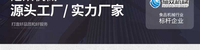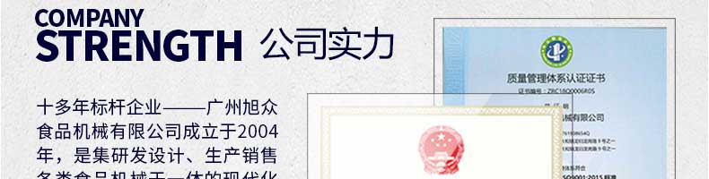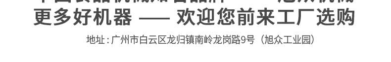 廣州旭眾食品機(jī)械有限公司是一家集科研開發(fā),生產(chǎn)設(shè)計,營銷服務(wù)為一體的現(xiàn)代化生產(chǎn)企業(yè)。現(xiàn)代化生產(chǎn)車間,精湛制造技術(shù),所產(chǎn)機(jī)械歷經(jīng)市場重重考驗,不斷贏得海內(nèi)外客戶的贊譽(yù)。
