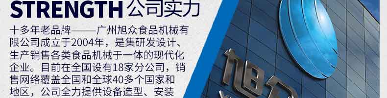 廣州旭眾食品機械有限公司是一家集科研開發,生產設計,營銷服務為一體的現代化生產企業。現代化生產車間,精湛制造技術,所產機械歷經市場重重考驗,不斷贏得海內外客戶的贊譽。